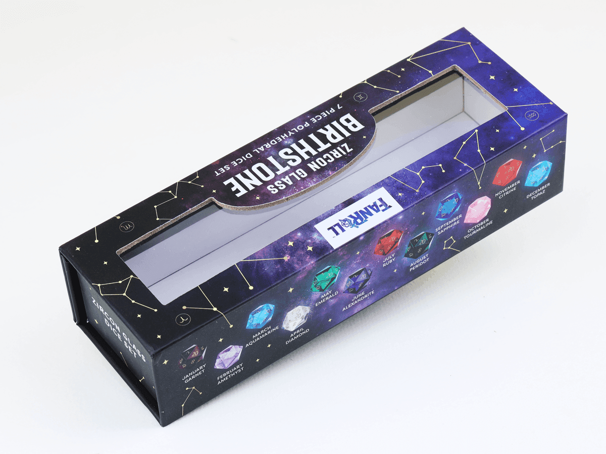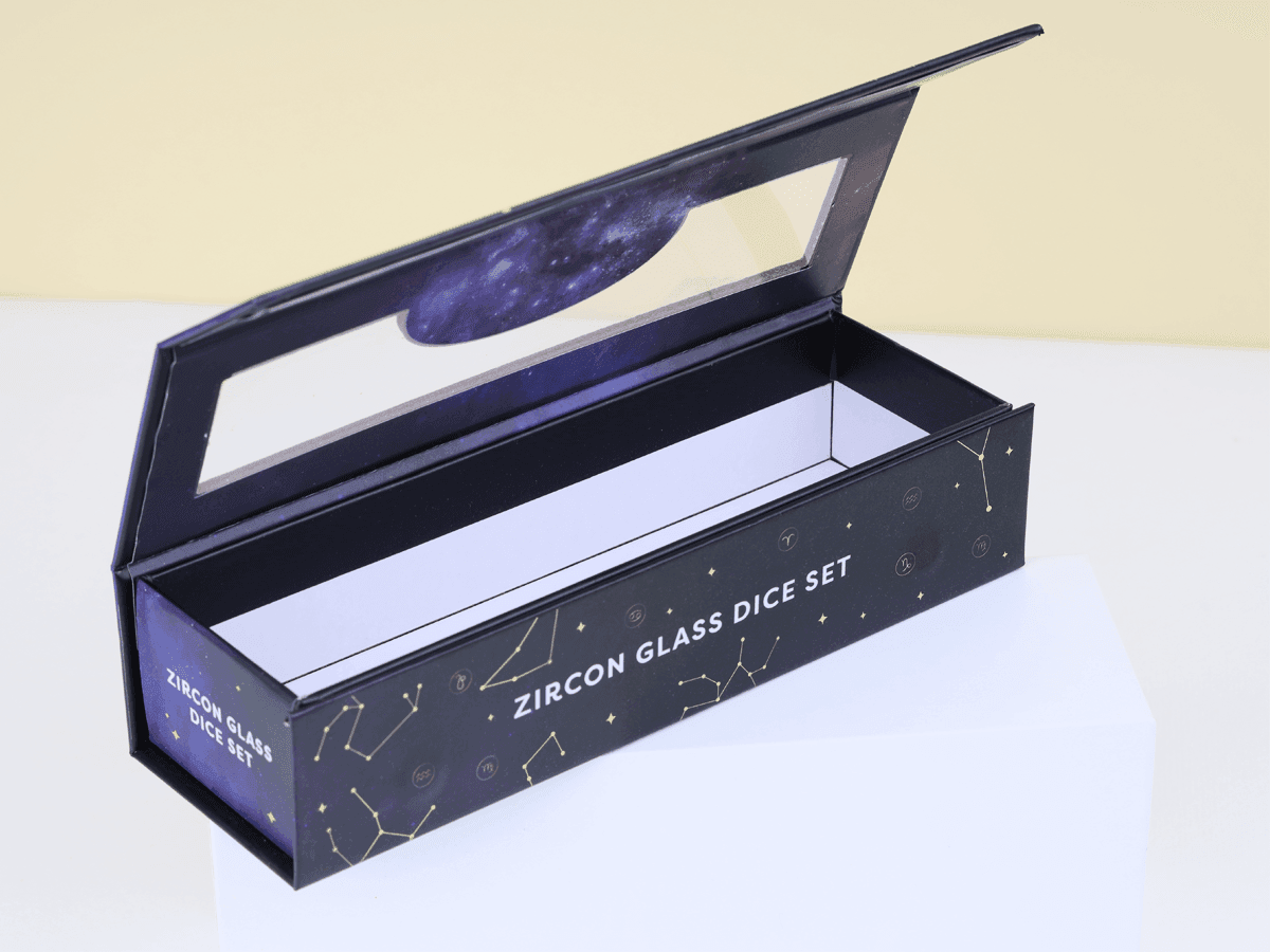 This project features a custom magnetic book-style rigid box designed for a zircon glass dice set. The structure combines premium presentation with practical functionality, making it ideal for gift packaging.